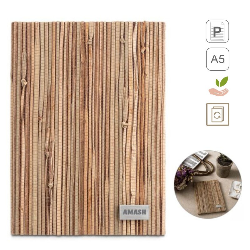 Caderno A5 de capa dura em palha natural. Incluso uma placa em metal, própria para personalização, para adicionar à capa. Contém 192 páginas pautadas em papel cor marfim proveniente de gestão florestal sustentável. Fornecido em caixa presente de papel kraft reciclado. A cor e o resultado da impressão nos materiais naturais pode variar entre produtos. 150 x 210 mm | Placa: 30 x 15 mm