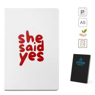 Indicado para brindes promocionais, ações corporativas e eventos com foco em sustentabilidade. O caderno A5 com capa dura em papel pedra é uma opção inovadora e consciente. Com 128 páginas pautadas (120g/m²), também feitas de papel pedra, este material é resistente à água e não utiliza fibras de madeira em sua produção, ajudando a preservar as florestas. Além de durável