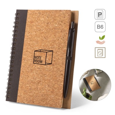 Caderno B6 de capa dura em cortiça e PET 100% reciclado. Contém 140 páginas lisas em papel kraft 100% reciclado e suporte para esferográfica. Inclusa esferográfica em fibra de trigo e ABS com clipe. Escrita em azul. A cor e o resultado da impressão nos materiais naturais pode variar entre produtos. Caderno: 130 x 178 mm |Esferográfica: ø10 x 141 mm