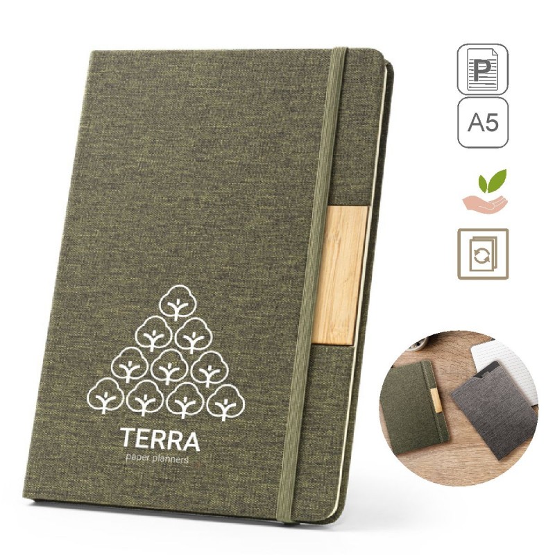 Perfeito para brindes corporativos, feiras e eventos que valorizam o design sustentável. Este caderno A5 de capa dura combina tecido PET 100% reciclado (rPET) com detalhes em bambu, trazendo um toque natural e moderno. Possui 160 páginas pautadas em papel cor marfim 100% reciclado