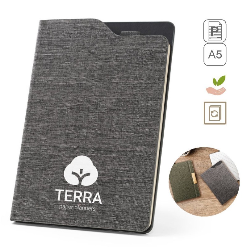 Ótima escolha para brindes corporativos, feiras e eventos sustentáveis. Este caderno A5 possui capa dura revestida em tecido PET 100% reciclado (rPET), combinando resistência e responsabilidade ambiental. Contém 160 páginas pautadas em papel cor marfim 100% reciclado