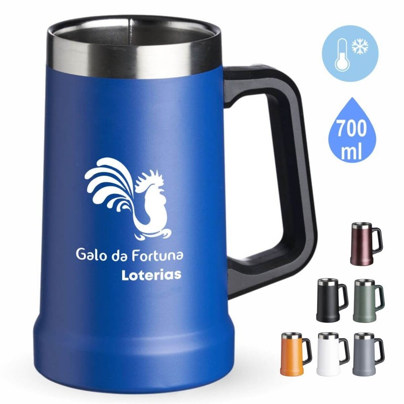 Caneca térmica confeccionada em aço inox com pegador plástico. Possui parede dupla permitindo assim maior conservação de temperatura.
