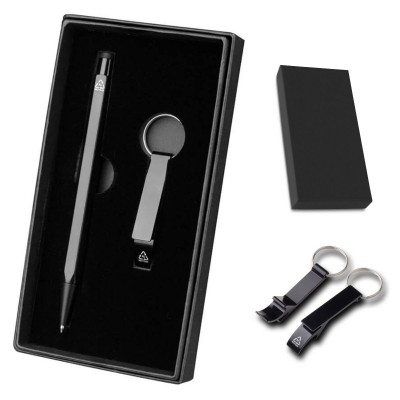 Este kit é uma excelente opção de brinde corporativo para empresas que desejam se destacar com ações promocionais sustentáveis e criativas. Ideal para eventos, campanhas ecológicas, feiras e kits institucionais, ele transmite inovação, consciência ambiental e atenção aos detalhes. O conjunto é composto por uma caneta fabricada em alumínio reciclado, com acionamento por giro (modelo twist), corpo com régua integrada e design minimalista, sem clipe uma combinação perfeita entre utilidade e estilo moderno. Acompanha um chaveiro funcional em formato de pé de galinha, também produzido em alumínio reciclado, que funciona como abridor de garrafas.