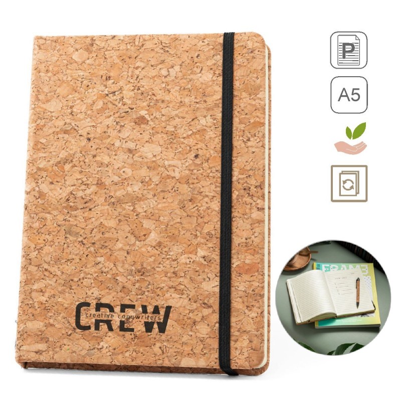 Brinde elegante e sustentável para campanhas promocionais, ações corporativas e eventos com propósito. Este conjunto une um caderno A5 e uma esferográfica, ambos com acabamento em cortiça natural, oferecendo um visual sofisticado e ecológico. O caderno possui capa dura e 192 páginas pautadas na cor marfim, produzidas com papel proveniente de gestão florestal sustentável.