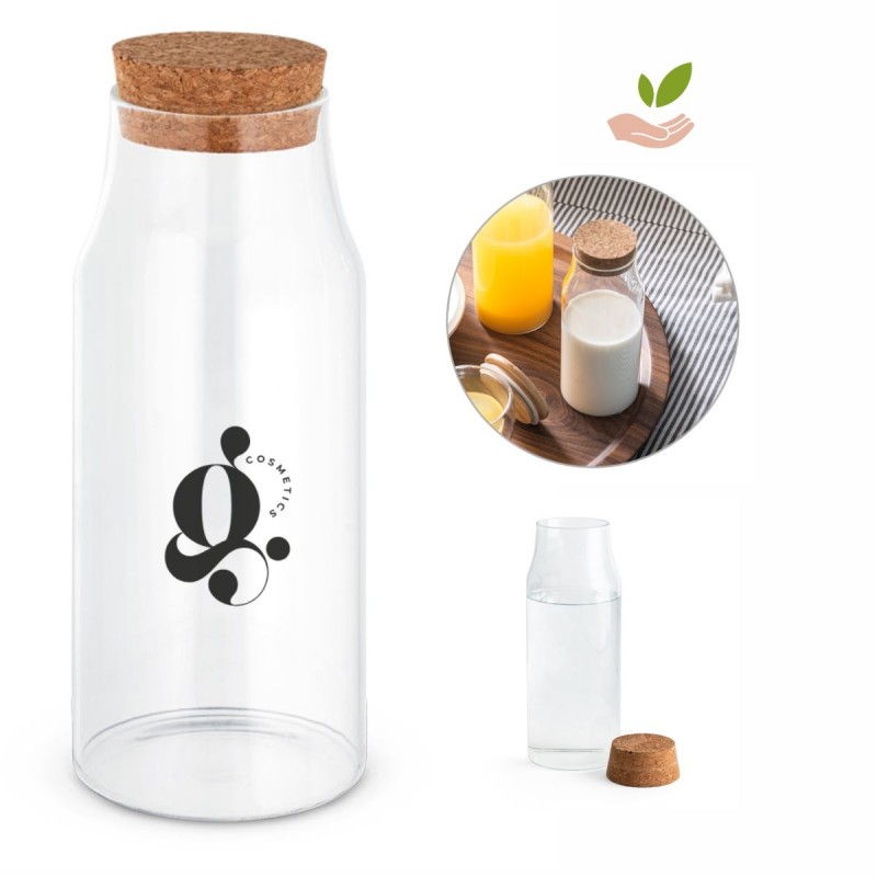 A garrafa de água para mesa em vidro borossilicato com tampa de cortiça une design sofisticado e funcionalidade sustentável, sendo perfeita para uso diário em casa, escritório ou eventos. Com capacidade de até 800 mL, o vidro borossilicato oferece alta resistência a variações térmicas, garantindo durabilidade e segurança no contato com alimentos, comprovada pela certificação EU Food Grade. A tampa de cortiça natural além de vedar eficientemente, traz um toque elegante e ecológico ao produto. A embalagem em caixa de papel kraft reciclado reforça o compromisso ambiental, tornando a garrafa uma excelente opção de brinde corporativo sustentável.