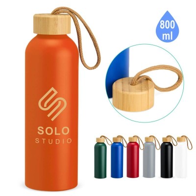 Garrafa de alumínio com capacidade de 800ml, produzida em material leve e resistente, perfeita para manter a hidratação sempre à mão no dia a dia. Possui tampa rosqueável em bambu com alça em algodão, que facilita o transporte e confere um toque sustentável. Um brinde moderno e funcional, ideal para eventos ecológicos, programas de sustentabilidade, ações promocionais e campanhas de conscientização ambiental.