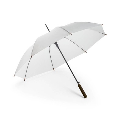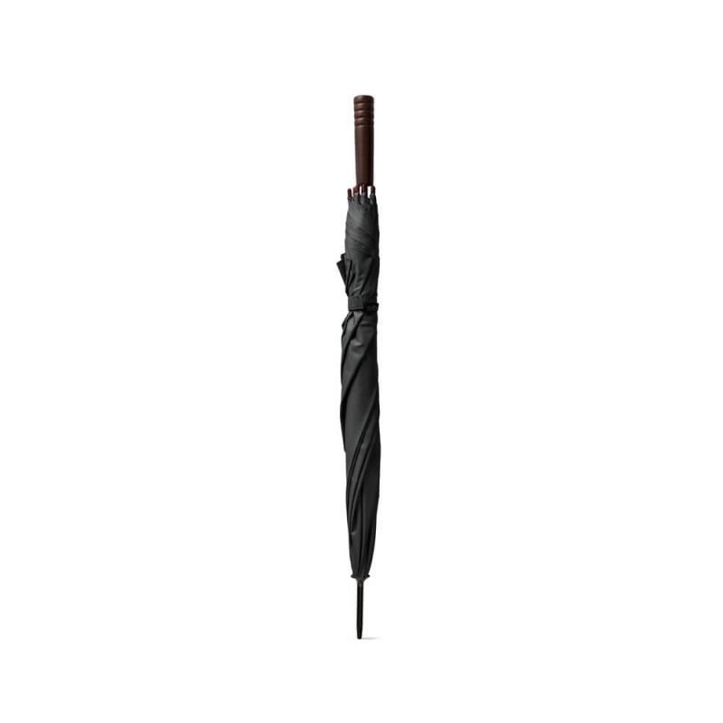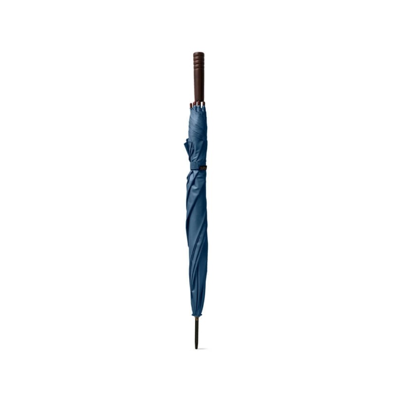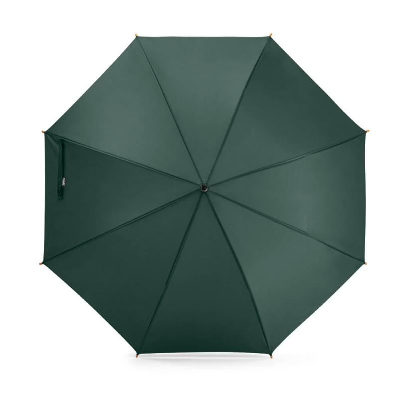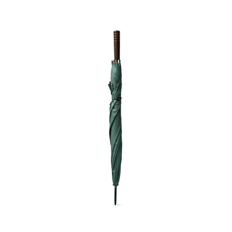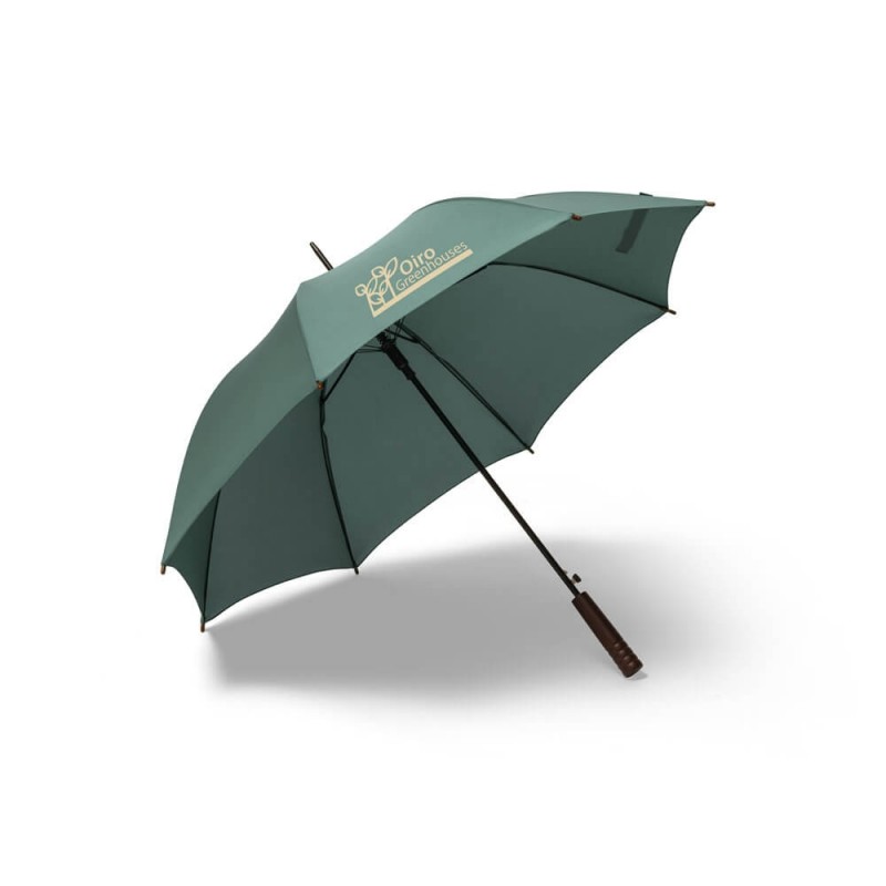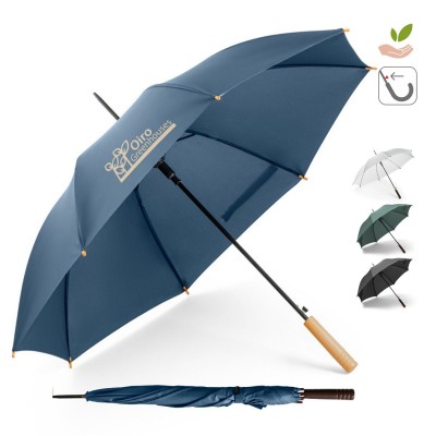 O guarda-chuva em poliéster 100% reciclado pongee 190T é a escolha ideal para brindes corporativos que unem sofisticação, consciência ambiental e funcionalidade. Indicado para ações promocionais sustentáveis, eventos institucionais e campanhas com foco em responsabilidade socioambiental, ele entrega uma combinação perfeita entre elegância e praticidade. Seu tecido é feito a partir de materiais reciclados (rPET), promovendo o reaproveitamento de garrafas plásticas com um acabamento premium e resistente à água. A estrutura metálica garante firmeza e durabilidade, enquanto a abertura automática facilita o uso em qualquer situação. A haste em metal oferece estabilidade, e a pega em madeira confere um toque clássico e refinado ao design.