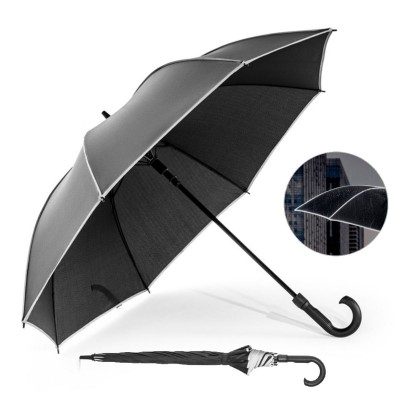 O guarda-chuva de 27" em poliéster 100% reciclado é um brinde corporativo funcional, sofisticado e com forte apelo sustentável, ideal para ações promocionais e eventos que buscam transmitir compromisso com o meio ambiente. Produzido em poliéster rPET pongee 190T, material proveniente da reciclagem de garrafas PET, ele oferece qualidade superior aliada à responsabilidade ecológica. A estrutura é reforçada com varetas e haste em fibra de vidro, garantindo alta durabilidade e resistência, inclusive contra ventos fortes, graças ao sistema à prova de vento. A abertura automática facilita o manuseio no dia a dia, oferecendo praticidade nos momentos de pressa.