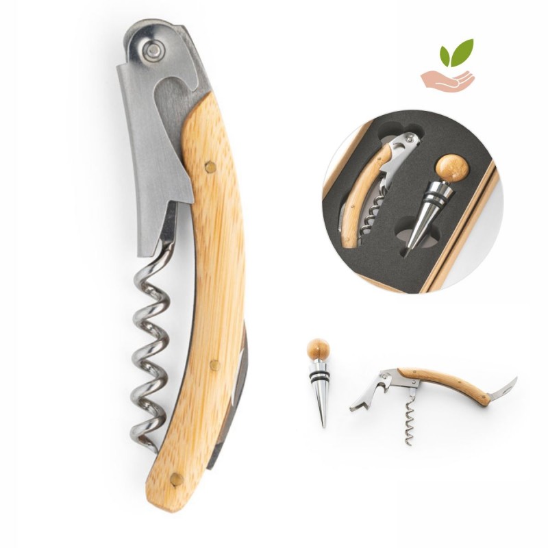 O conjunto de vinho com dois componentes em metal e bambu é um brinde corporativo elegante e sustentável, ideal para presentear clientes, parceiros ou colaboradores em ocasiões especiais. Composto por um saca-rolhas e um salva-gotas, ambos com detalhes em bambu natural e estrutura em metal resistente, este kit combina funcionalidade e sofisticação em cada detalhe. O bambu, por ser um material natural e renovável, apresenta variações únicas de cor e textura que tornam cada peça exclusiva, valorizando ainda mais o toque artesanal e ecológico do presente. A personalização com logomarca pode ser feita por gravação a laser, resultando em um acabamento refinado e discreto.