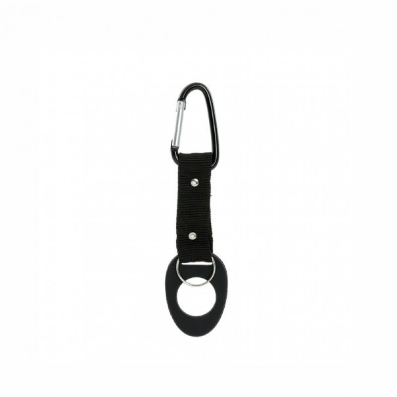 Este suporte é formado por uma alça de nylon ligada a um anel maleável, próprio para o encaixe em bocais de garrafas PET, em uma das pontas enquanto a outra apresenta um mosquetão e uma argola para chaveiro.